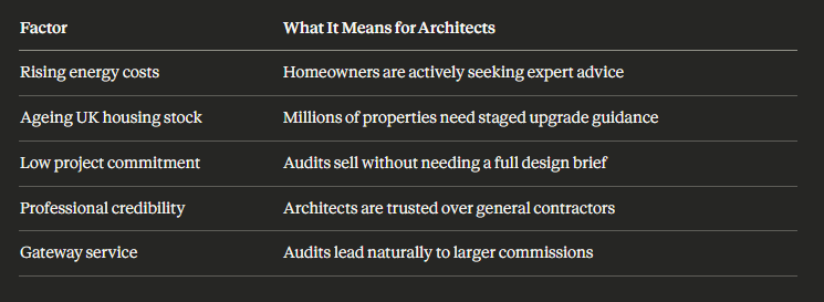 Retrofit audits for architects represent a rare alignment; a real client need, a service that fits naturally within existing expertise, and a commercial opportunity that requires very little setup to launch.